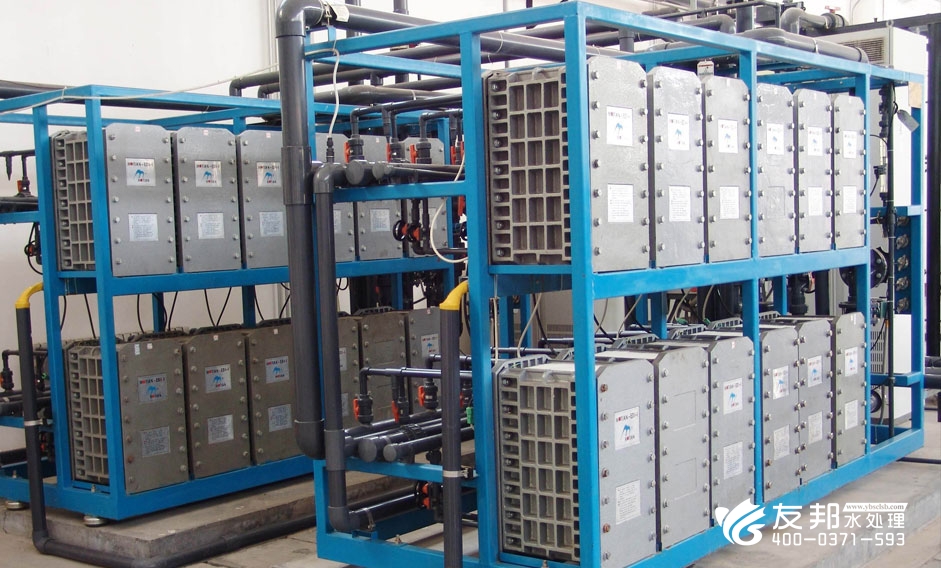 連續電除鹽是利用填充在淡水室中的混合離子交換樹脂吸附給水中的陰陽離子,同時這些被吸附的離子又在直流電壓的作用下發生橫向電遷移,并分別透過陰陽離子交換膜進入濃水室而被去除。另一方面,在給水前進的方向上,由于離子不斷被去除,溶液的電導率越來越低,在直流電壓的作用下水會發生解離以產生足夠的H+和OH-離子來維持系統的電流量,這些水解離產生的H+和OH-除了發生橫向電遷移外,還會就地把吸附有離子的樹脂再生,從而實現連續深度脫鹽。因此EDI過程的本質是離子交換、電滲析和水解離產生H+和OH-離子再生樹脂這三個過程的綜合過程。在此過程中,離子交換樹脂僅僅為離子提供一個導體的作用,因此不需要用酸和堿進行再生。電滲析才是EDI用來脫鹽的手段。但是樹脂終會因吸附飽和而發生離子泄露,無法使除鹽過程連續而穩定地運行。水解離是EDI的核心所在,而要實現水的解離。