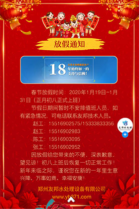 春節放假時間為:2020年1月19日至2020年1月31日,2020年2月1日正式上班,請大家提前安排好時間!按時返回上班。